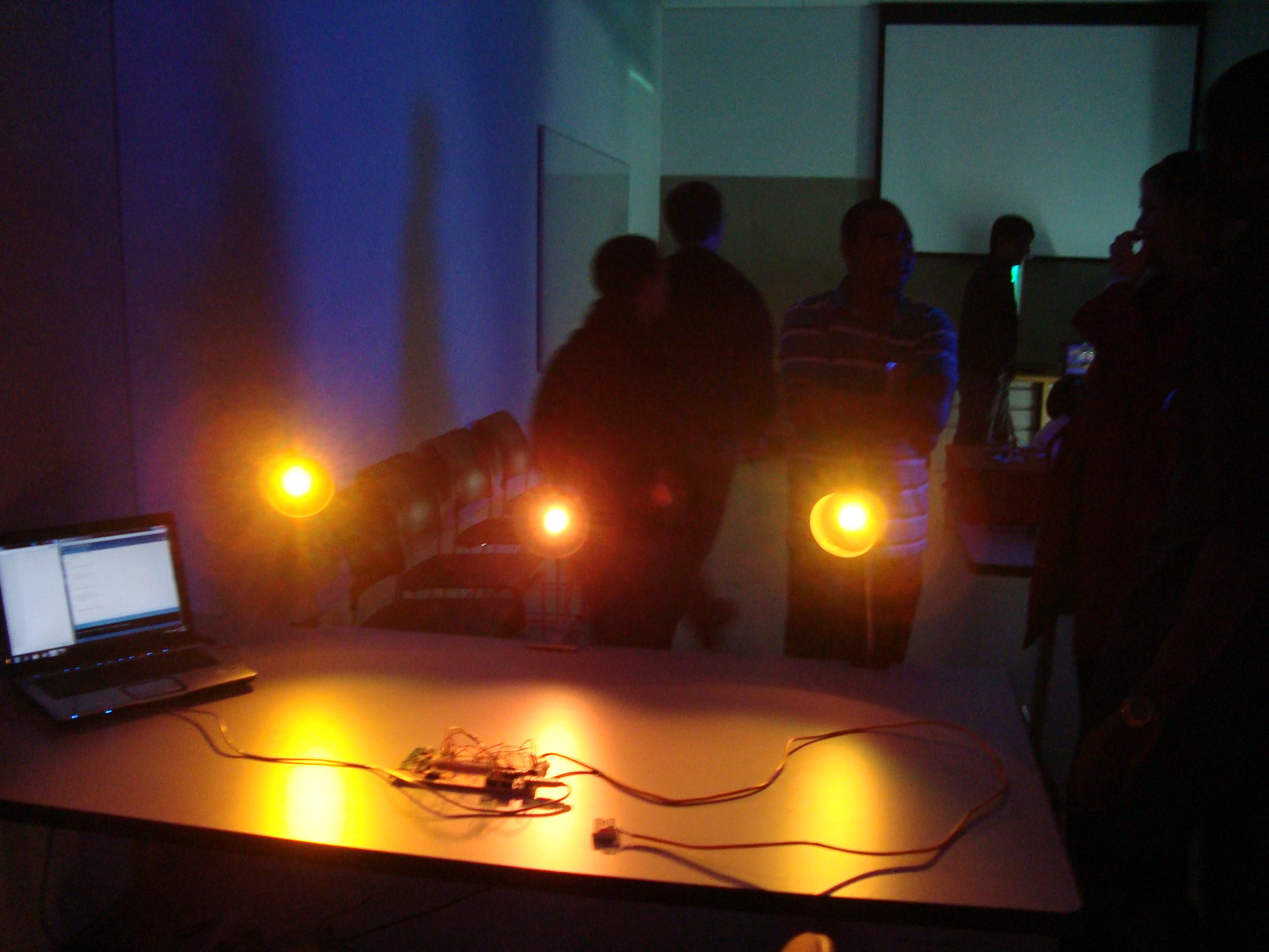In the Mood is a work by Eric Flye. Heat sensors, LED lights, and a computer program calculate your temperature and your mood.