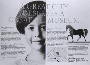 Last year, the DMA marked its 25th year in the Arts District, and the 30th anniversary of the successful bond election that brought it here. Today’s photo post includes images from A Dream Come True: the Dallas Arts District, an exhibition of images and ephemera (from the Museum’s Archives) that documents both the DMA’s journey from bond campaign to building construction, and the recent growth of the Arts District. A Dream Come True is on view in the Museum’s concourse until January 31st.