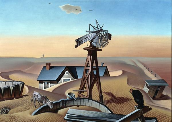 Alexandre Hogue’s Drouth Stricken Area purposefully exaggerates the conditions of the dry Texas landscape in order to gain the viewer’s attention and to elicit a strong emotion. He believed that the over-cultivation of fields and the thoughtlessness of man were the causes of the region’s demise. The erosive state of the Dust Bowl is the focus of Drouth Stricken Area, one of six paintings in Hogue’s Erosion Series.I was raised on a ranch in the Dust Bowl and I was there when the dust storm hit….I saw lush grazing land turned into sand dunes. Thistles blew in and fences would be covered in just a few hours. Railroads had plows fighting it just like they fought snow….To me, as an artist, it was beautiful in a terrifying way. I painted it for that terrifying beauty. Alexandre Hogue