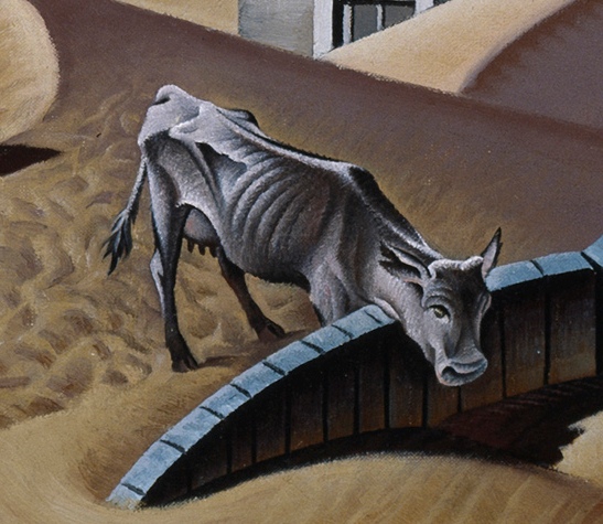 This cow stole my heart back in 2002 and I have been in love ever since. Although not many people would say that an image of an animal in desperate need of food, water, and attention is something to be excited about, my adoration is based upon what this cow represents. The sickly bovine is a small detail in a painting that is a response to the economic challenges that plagued the United States during the 1930s. The artist, Alexandre Hogue, is one of many artists, authors, playwrights, and musicians that approached the social, political, and economic subject matter of the Depression era head on.