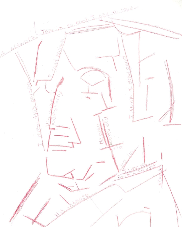 The DMA is partnering with Joanna Henry and students from the Exploratory Arts Academy at Greiner Middle School to investigate how words and images can be integrated in works of art. During their visit to the museum on December 15th, students participated in a ninety-minute tour featuring works of art that involve both images and text. By suggesting that “words are art,” and talking about artists as “visual storytellers,” students realized that the artistic gap between words and images isn’t as wide as they might have imagined. Students created concrete poems (poems in which the words are arranged to produce a composition with visual, as well as poetic, meaning), sketched, wrote captions, and composed written responses in an “accidental,” automatic style. The Greiner students have plans to come back to the museum, but here are some of the works they saw during their first visit, and their own visual/textual responses: