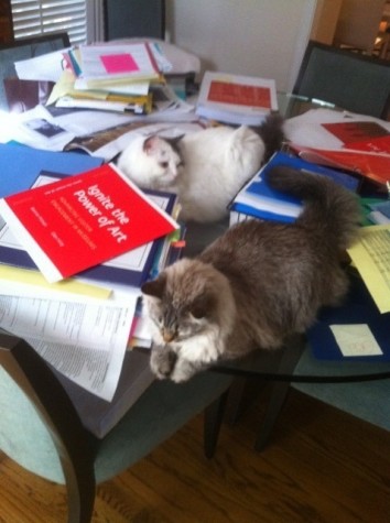 Ending on a light note, Bonnie kept us entertained throughout the editing and production process by sending digital pictures of her two cats, Leda and Perseus. Owing to the late hours she usually keeps, Bonnie was frequently hard at work on this book at one or two o’clock in the morning, seated at her glass work-table, with Leda and Perseus lying on—or playing with—stacks of galleys, photo contact sheets, charts, layouts, and reports—all of which offered the cats an ideal playground. I still have the early photographs showing them stretched out on a hoard of papers and folders. The later pictures depict their puzzlement as the glass tabletop finally resurfaced and the papers receded. And there’s a final shot of the cats sitting wistful, but perhaps also slightly triumphant, on a table cleared of everything but a vase of flowers and a single copy of the printed book. I’m sure Leda and Perseus look forward to a sequel.