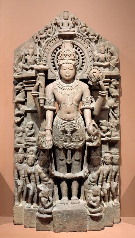 Richly jeweled as a king would be, Vishnu can be identified in this relief by his traditional attributes: a mace, conch shell, sun wheel (chakra), and beads. He is shown as a calm, upright figure surrounded by his heavenly court and divine kingdom. As the Preserver to Shiva’s destruction, Vishnu is the bringer of blessings and prosperity to his followers.