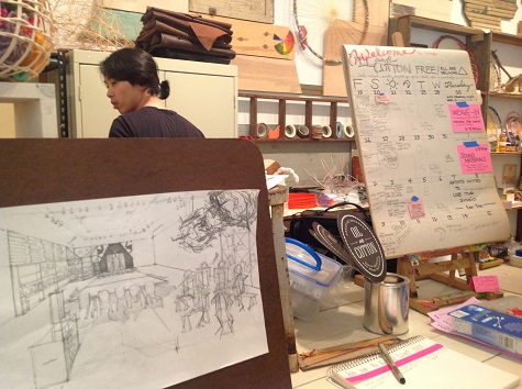 O + C: At first, people engage with the spectacle – thanks to our architect Esther Walker, who captured the feel of our place with her ingenuity and labor of love. Then they wander in and realize it is there for them. They seem to appreciate the options. Parents can make something or just sit and relax, teens can draw with nice materials in a studio, little kids can make forts and roll around in the “park” of leather hides and circle looms made by my daughter. And everyone is invited to hang work on the wall, participate in free classes, ask questions, and use the studio when the Museum is open.