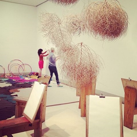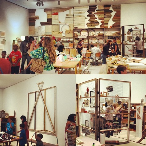 O + C: Um no. It was utterly insane in a fantastic way. We naively set up drawing activities, thinking for the first night, we’d keep it simple. Before we knew it, the whole place was blowing up with weaving, sculpting, collage, sewing, you name it. All ages, including artists, curators, and toddlers, were working side by side at a huge table covered in donated supplies.  I heard someone comment that he couldn’t tell where the exhibition ended and the education began. Yippee!