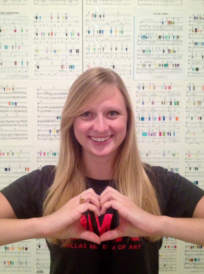 • hayley2Hayley Prihoda – McDermott Intern for Gallery and Community Teaching. Picturing that Day stood out to me on my first tour of the Jim Hodges: Give More Than You Take exhibition and, after innumerable visits, has remained one of my favorite works in the show. Having performed in choir in high school, the imagery of the sheet music immediately reminded me of my adolescence. Upon closer examination, I was excited to discover that the piece also features two of my favorite songs – “Landslide” and “Climb Every Mountain”. My mom is a beautiful singer and my sister and I grew up listening to Fleetwood Mac and watching the Sound of Music. Now that I am 1000 miles away from my family, I am very grateful to have this connection to home on view at the DMA.