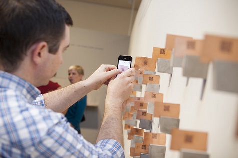A visitors scan one of the QR codes included in the installation