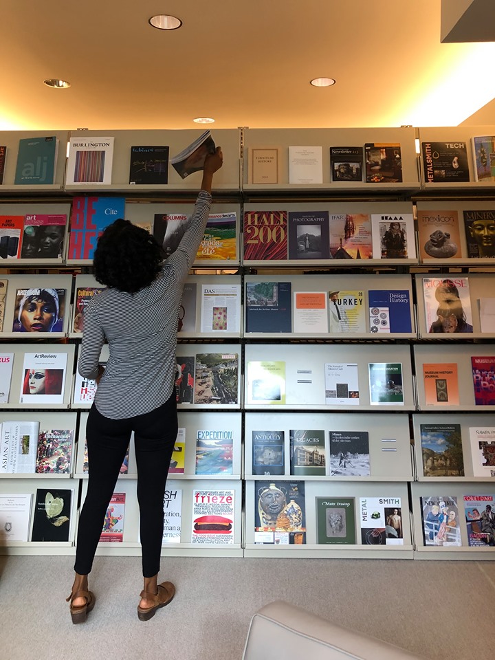 In the DMA’s Mayer Library, thanks to a team-based summer moving project, you can now browse 500 more books than before, along with literally thousands of art magazine issues dating from the 1800s up to today. In order to make the items available, new shelves were added and the staff moved almost everything to new locations—over 60,000 items from 2,241 shelves! The library adds an average of 1,500 items every year, but most of them are stored in closed stacks—that means the books are available on request; however, the good news is that as soon as the books are processed and in the online catalog, we display them in a New Books area. New titles are on view every week, so no matter when or how often you visit the library, there is always something new and exciting to discover. Within this expanded browsing area, you can also now find publications by the DMA all together right at the front of the library, along with the current exhibition catalogs. If you don’t see what you’re looking for in the reading room, our reference librarian on duty will be happy to help you find it. We plan to keep adding items to our reading room selection, and your question might help us do that. We look forward to welcoming you to the library—see you soon!