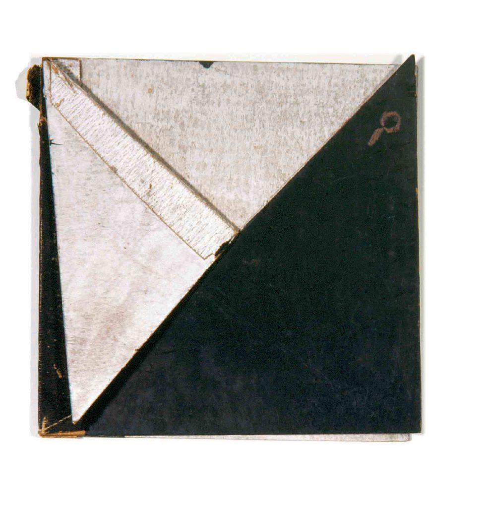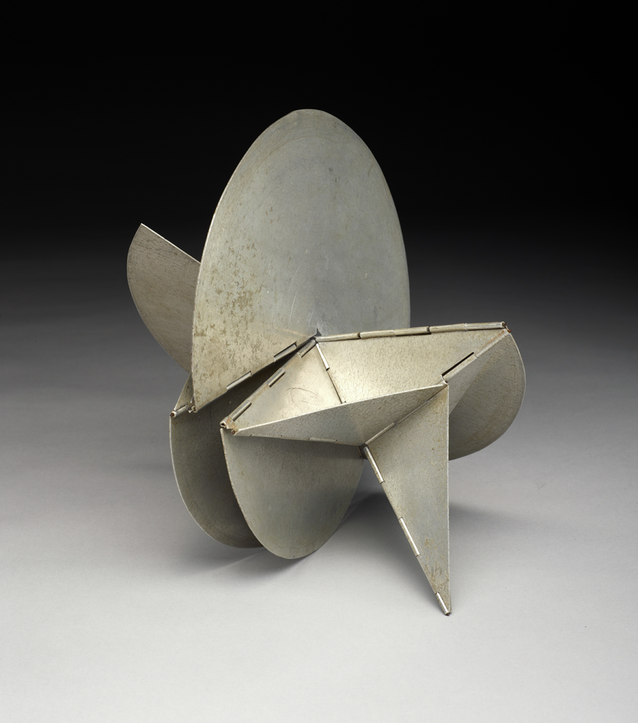 Swiss Concretism promoted geometric art, often using industrially derived materials, which became especially attractive to artists in South America, where it complemented the region’s rapid industrialization. When a sculpture by Swiss Concretist Max Bill won first prize at the inaugural São Paulo Biennial, it had a huge impact on young artists there, such as Lygia Clark. Clark’s Cocoon revolutionized Bill’s use of geometric forms in Rhythm in Space. She takes a layered square, and through a simple action—folding one corner of the black foreground across the composition—she introduces the element of time and irregularity that will be heightened in her later Critters, which have no default form and can be manipulated by the viewer to create multiple configurations. Unlike Swiss Concretism, Clark used organic metaphors to describe these works.