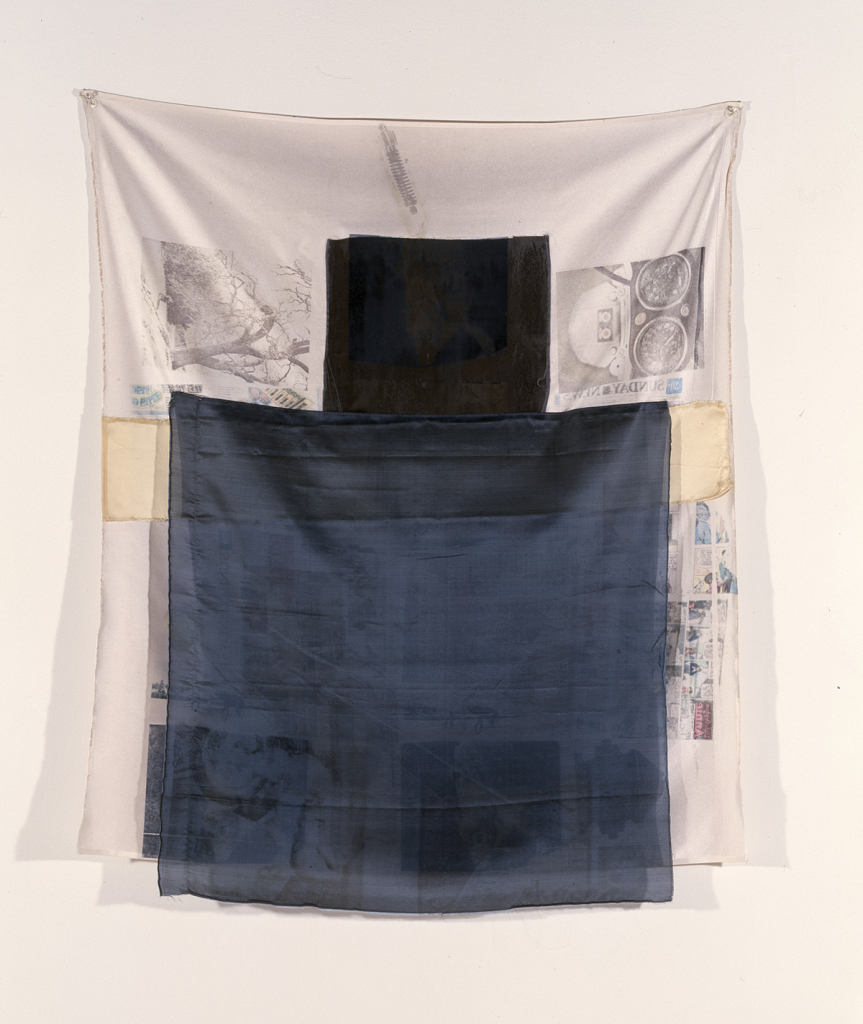 Using a hair dryer and polyvinyl acetate adhesive—commercially available since 1947 as Elmer’s Glue-All—Takesada Matsutani discovered that he could create corporeal, bulbous forms by blowing air into the material from behind until each “bubble” burst. Affixing them to the surface of his paintings, Matsutani constructed uncanny compositions. Similar to Matsutani and other members of the pioneering Gutai collective in Osaka, Robert Rauschenberg sought to blur the distinction between art and life through the use of everyday materials. For his Hoarfrost series, he transferred newspaper images to pieces of diaphanous fabric. After meeting the Gutai collective in 1964, Rauschenberg later collaborated with them, including onstage.