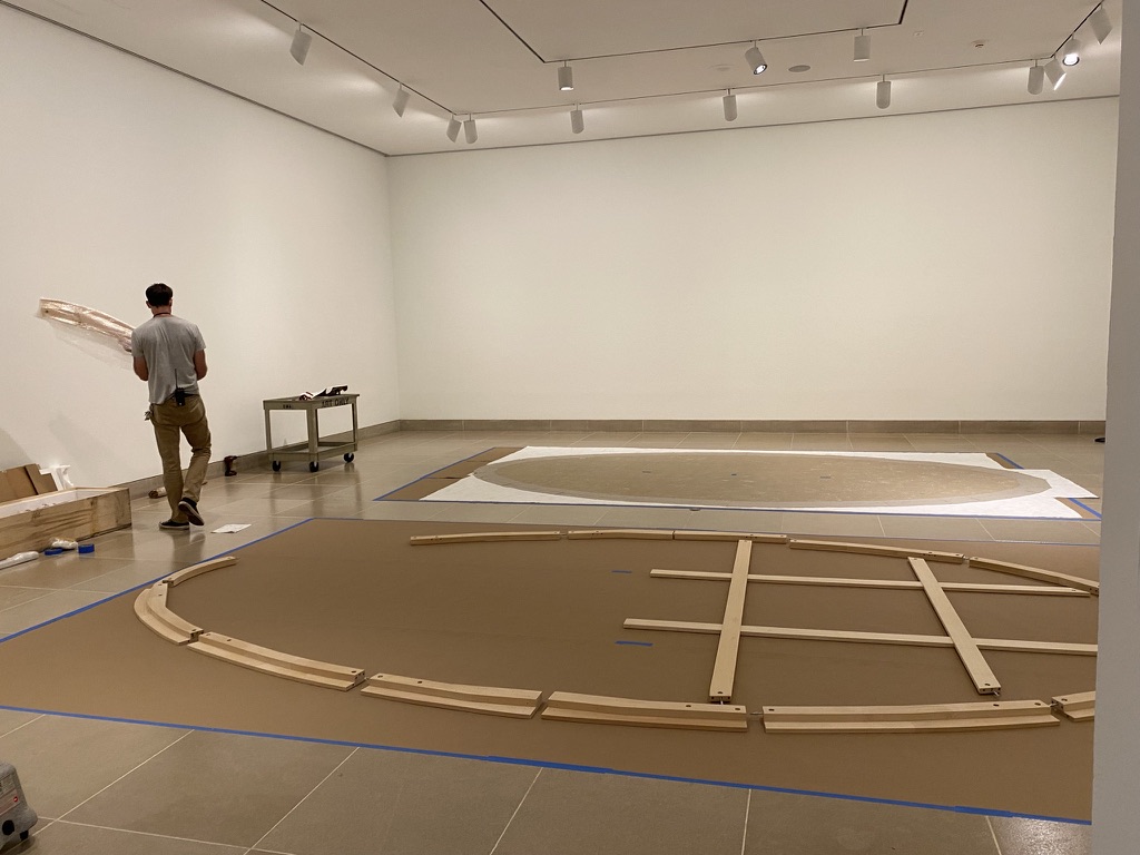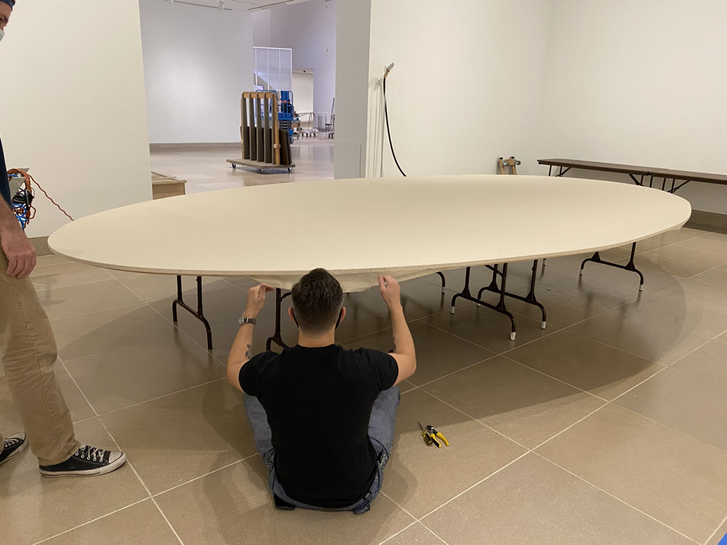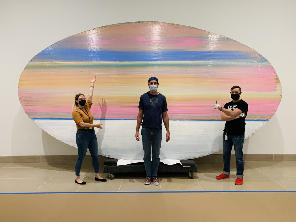 It was a true team effort—the painting measures over 5 meters by 3.5 meters, and weighs over 200 pounds! This painting is unique in that the artist has applied so many layers of paint that the paint is in fact thicker than the canvas, which changes the entire physics of the work. It has also traditionally been shown pinned directly to the wall, which was possible in 1970 when it was painted, but now the work has aged and needs a new approach to ensure longevity.