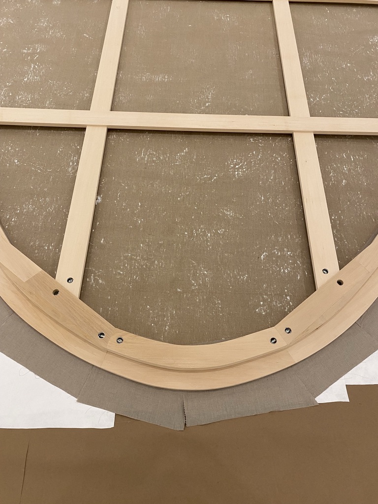 We worked directly with a stretcher maker in New York to design a stretcher that would hold the weight of the piece while remaining thin, giving the appearance that the work is pinned to the wall.