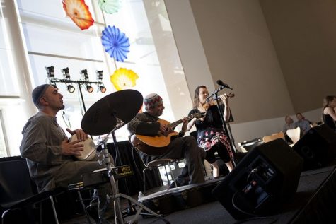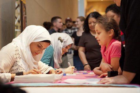 A work by Houston-based Iranian-American artist Soody Sharifi is now on view in the Keir Collection of Islamic Art Gallery. Courtly Love, an archival inkjet print from 2007, is an adaptation of a 15th-century painting in the Keir Collection. The original painting is an illustration of a tale from the Khamsa of Nizami, a collection of five tragic love poems. It depicts a scene from the romance of the Iranian king Khusraw and Armenian princess Shirin. Drunk and guilty of an amorous tryst, Khusraw has arrived at Shirin’s palace on horseback. Shirin, peering out from a window, is counseled by an older woman and refuses him entry. The scene is witnessed by a variety of attendants, including three scribes holding poetic manuscripts below. A darker mood is also present; anxious angels who know the inevitable tragic outcome of the story hover at upper left, while two gardeners with golden shovels foreshadow the twin graves in which the lovers will lie for eternity.