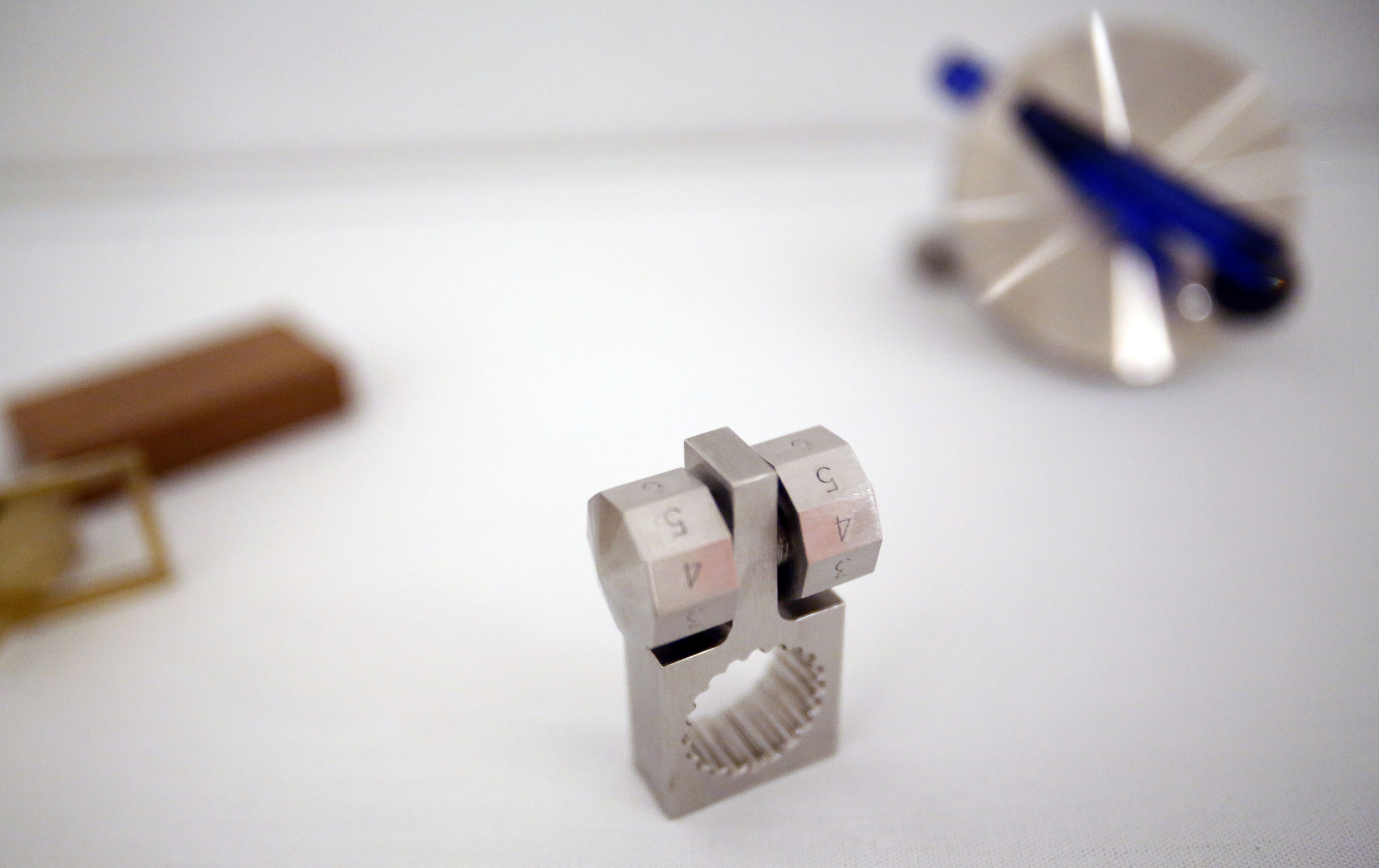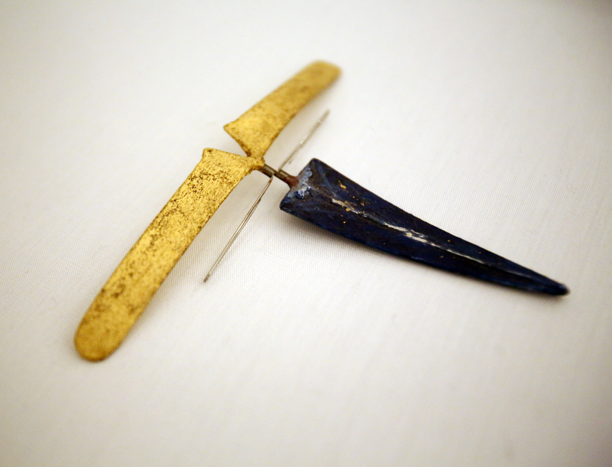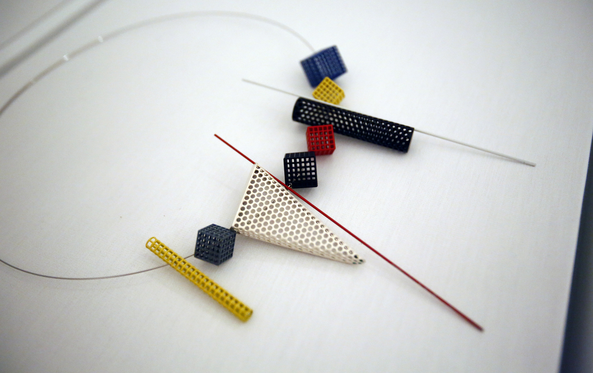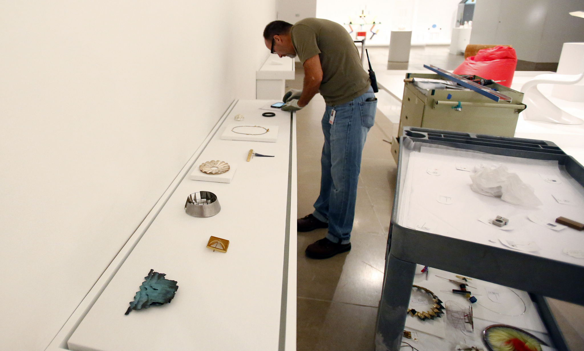 Doug Velek takes measurements for the two pieces of jewelry by Katie Collins. Prior to installing the work, the preparators made the wedges and lifts used to display the jewelry in the exhibition. After confirming that the necklaces were centered on the wedge, preparators used pins to secure them in place.