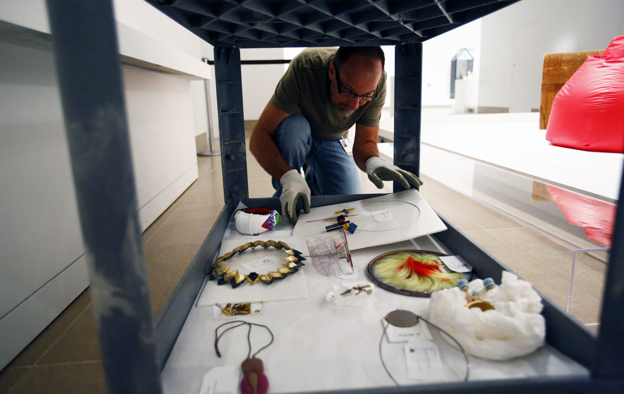 Curator Sarah Schleuning and preparator Russell Sublette discuss the placement of the three stools by Faye Toogood.