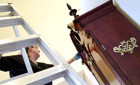 DMA exhibition staff, including preparators John Lendvay and Lance Lander and exhibitions graphic designer Kevin Parmer, install the newly opened Form/Unformed: Design from 1960 to the Present in the Level 4 Tower Gallery.