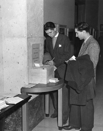 Young men voting for their favorite work in the exhibition "Portrait of America," September 30-November 5, 1945 (Photograph from the Studio of Wm. Langley)