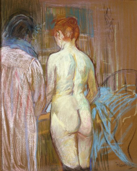 There are unique materials scattered among all the cultures that make up our collection. As you look at the different materials, some might stick out as interesting or odd, but for the artist making that piece it would not have been such a strange choice. This is the case in the pastel work by Henri de Toulouse-Lautrec in which he used emery board, or emery cloth, as the base. This has similar qualities to sandpaper—slightly rough and coarse compared to traditional canvas. Using a delicate medium like pastel on something that will rip apart the creamy texture was a technique he learned from studying 18th-century pastellistes. Lautrec used the technique to create the beautiful, modeled shadows on the woman’s back with the heavier application of pastel. Although today we might think of emery board as an interesting material, at the time the work was created it would have been somewhat traditional for the pastel medium.