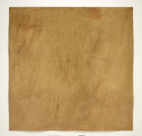 Contemporary artist Meg Webster was influenced by the Land art movement in the 1970s and studied under Michael Heizer. This influence led her to work primarily in sculpture using natural elements like plants. Webster’s untitled work in our collection is not a sculpture but one of her works on paper. These works share the same focus on the earth and connection to nature with her use of materials such as soil, ash, beeswax, and spices. Untitled uses turmeric to create a textured, dyed element on the paper. She uses natural materials in this series, but on a more intimate scale compared to her room-sized works with living plants. Using natural elements to dye or paint isn’t new, but using turmeric in its raw form shows Webster’s ability to create art without changing the natural form of the materials she uses, while also giving the piece a multisensory effect through smell and the visually distinct color.