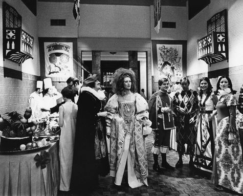 (left to right) Doug and Patty Campbell, Eric Graham, George Lee, Schatzie Lee, and Eleanor Graham at the 1974 Beaux Arts Ball, “An Elizabethan Evening.”