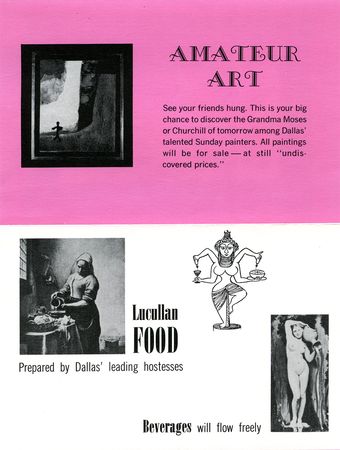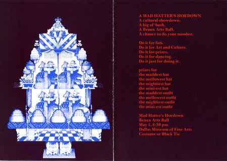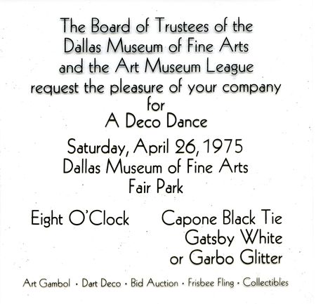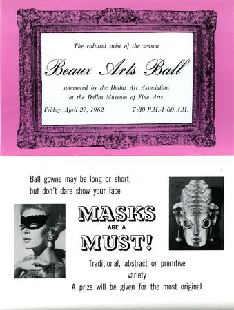 This year’s Art Ball, held this past Saturday, marks the 50th occurrence of the event, which started as the Beaux Arts Ball in 1962. Each Ball usually has a theme, with invitations to match. Below are a few of my favorites from the 1960s and 70s, when the Museum was located in Fair Park.
