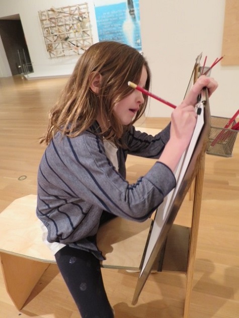 After exploring the galleries we stopped at the hands-on area of the DMA (The Center for Creative Connections), where you can make your own work of art. Fiona drew and was able to make a rabbit sculpture with a piece of egg crate and pipe cleaners. She was very proud of her work and asked if she could keep it, and I told her yes. She then surprised me by saying she wanted to give it to the nice lady, Joyce.