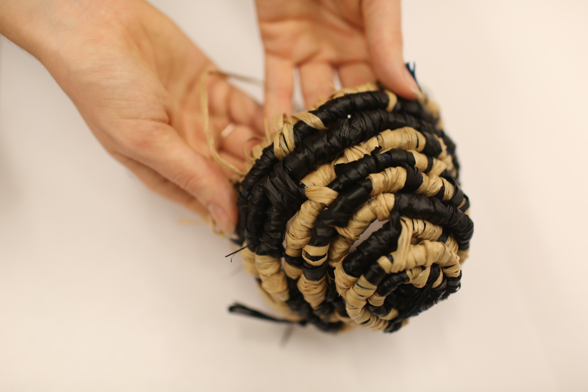 Take the end of your tan or black raffia strand and loop it through the spiral to secure the basket center.