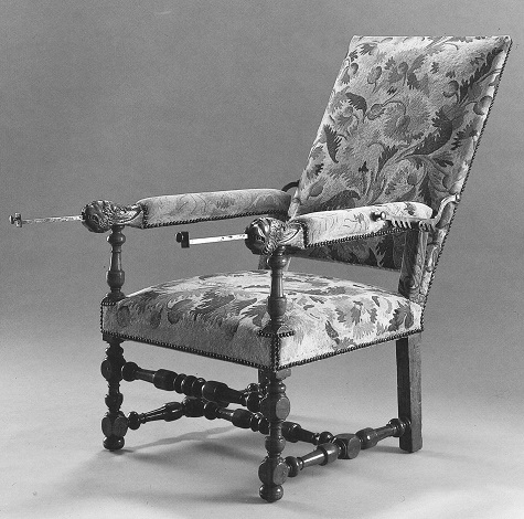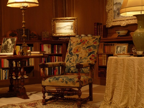 Possibly one of the coolest furniture items in the Reves Collection, this chair actually reclines using steel rods that come out of the handles. You can barely see them here, but pulling them out and pushing them in changes the recline of this chair. It is probably not as comfortable as our plush recliners today, but it was still the prototype. This early version of the recliner was originally in Mlle Chanel’s bedroom.