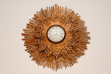 Mlle Chanel had a set of two matching clocks, this one, which is now hanging in the Grand Hall, and another that hangs above the fireplace in the Reves Salon. When Wendy and Emery Reves moved in, they enjoyed these gold clocks and kept them in their original locations before donating them to the DMA.