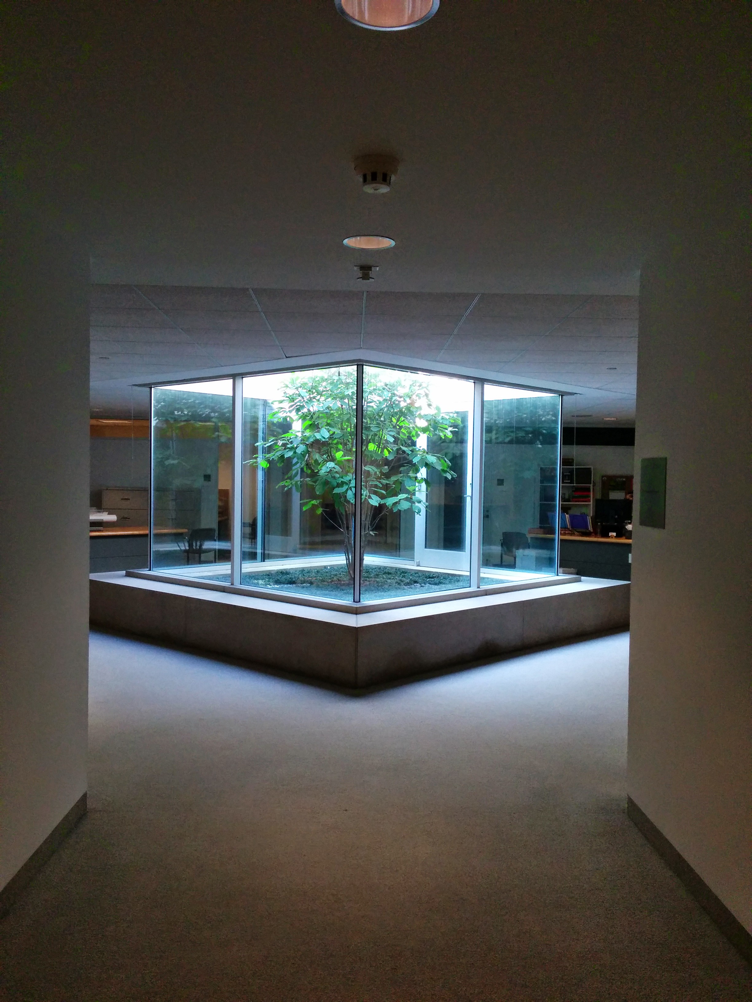 I have always loved the tree that grows in the middle of our upper office area, particularly when viewed from one of the hallways radiating from it.   Also, the tucked-away chairs at the corner windows on the fourth floor are my favorite place to sit and read a few pages of a book during a break, followed only by the view of Fleischner Courtyard from the Mayer Library (Did you know we have a fantastic library the public is welcome to use for research?)
