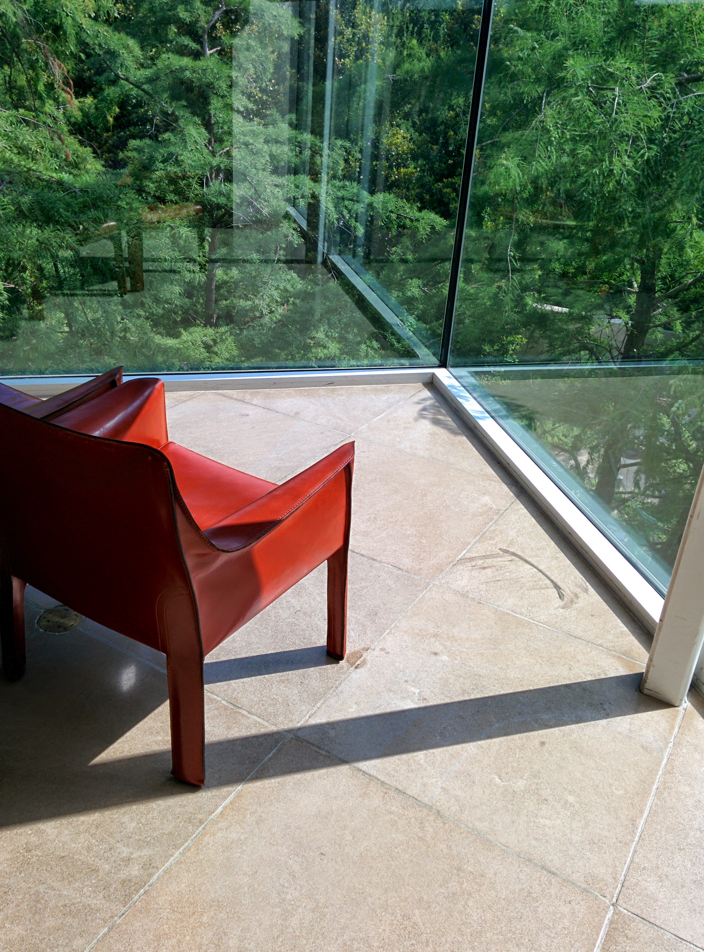 Nearest the Ross entrance in the Founder’s Room are a set of window panels designed by Frank Lloyd Wright, originally from the Francis W. Little House in Deephaven, Minnesota.  It was interesting viewing the geometrically-designed “grilles” in the window against one of the orange-and-white striped hanging cloth panels in Daniel Buren’s Sanction of the Museum from 1973.