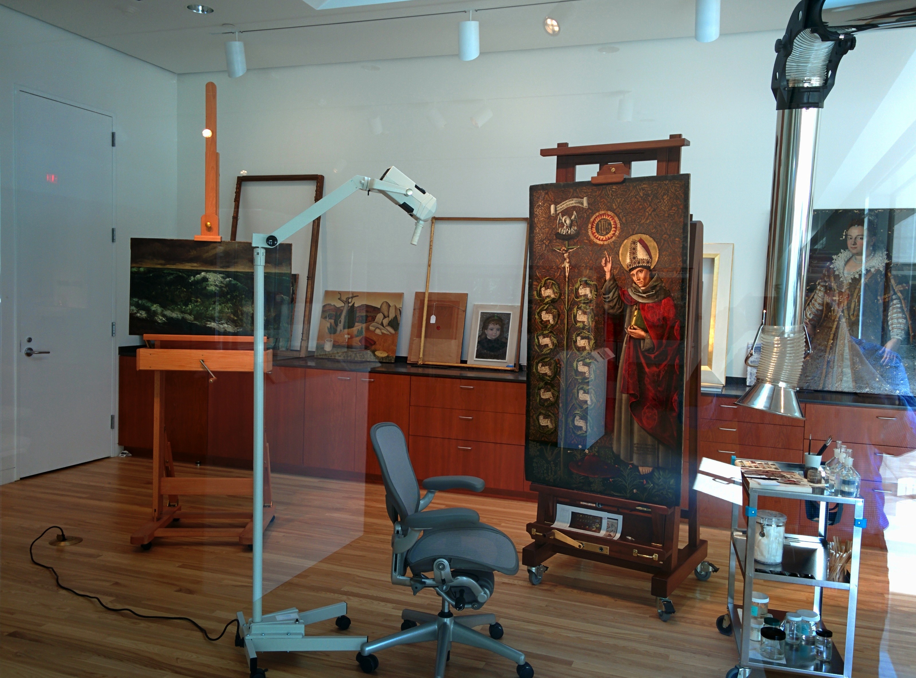 Two newer features of the Museum that I am quickly becoming quite fond of are the recently acquired painting by Norwegian Romantic painter Johan Christian DahlFrederiksborg Castle by Moonlight, and the Conservation Studio across from the Founder’s Room.  Not only is the Conservation Studio fascinating to glimpse into, but the works on display outside it offer insightful peeks into little-seen aspects of objects like gallery labels and abandoned paintings hidden by frames.  (And, if you look carefully at my reflection in the window, it appears the female figure in the painting is tapping me on the shoulder.)