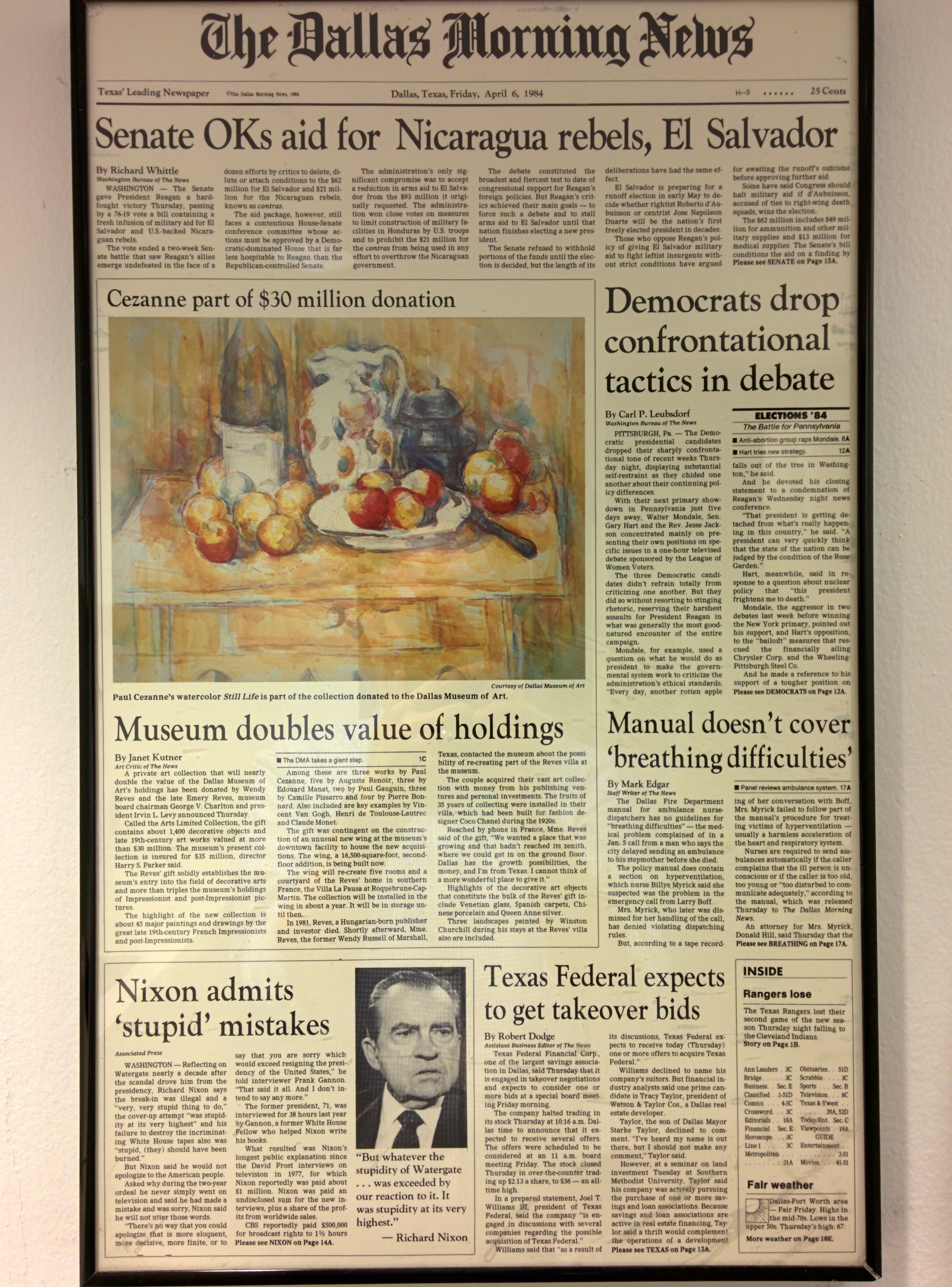 Finally, there is a little tucked away kitchenette in the Museum’s office area where I was always fascinated by a framed Dallas Morning News front page from 1984 announcing the donation of the Reves Collection, and I was pleased to discover it was still there.  I love how this is an historical artifact of the worldly context during which this important collection was added to the Museum, a preserved moment in time akin to the recreation of the Reves’ villa here.