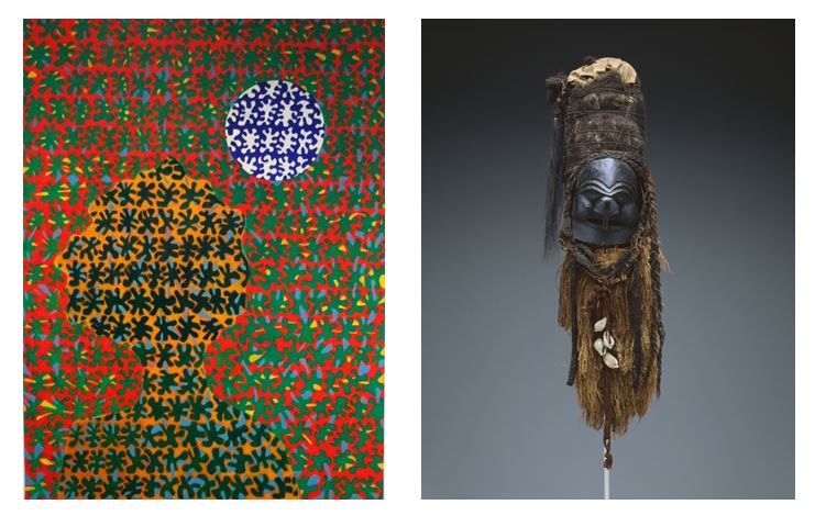 “I would love to see my painting, Garden of Earthlike Planet Delights, paired with this mask. The mask is primal, dark, mysterious, and speaks of danger and tribal ritual. I love listening to the big three Diaghilev-era Stravinsky ballets in sequence and on ‘repeat all’ while I paint. For me, it isn’t hard to imagine some faraway, earthlike, but strange world in our galaxy where there may exist primitive humanoid tribes experiencing life in ways similar to our own prehistoric times.” – David Caldwell, Gallery Attendant, 1 year at the DMA.