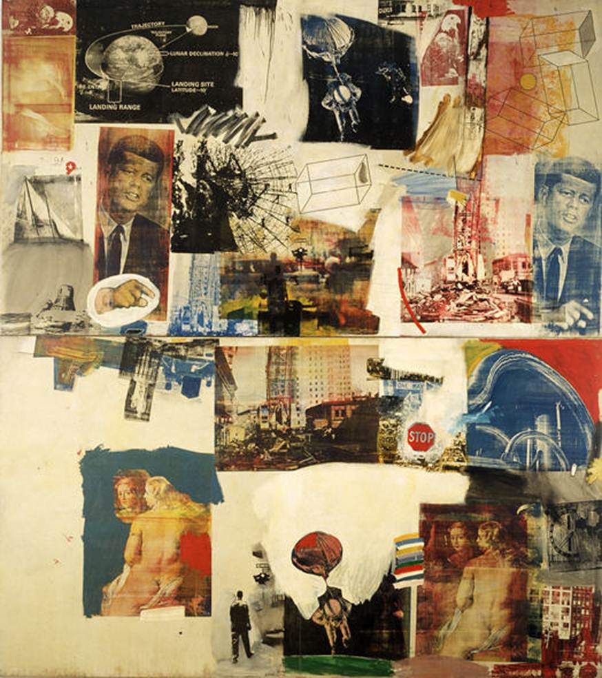 Here, Robert Rauschenberg has combined everyday images of President John F. Kennedy, space capsules, an American eagle, construction sites, urban scenes, and diagrams of the earth and moon from outer space to reflect 1960s America. These found images he has incorporated with art-historical references and his own freely applied strokes of paint.