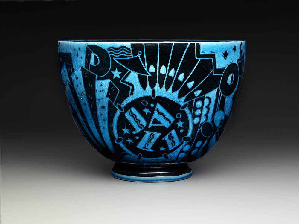 The first “Jazz Bowl” came about when Eleanor and Franklin D. Roosevelt commissioned Cowan pottery to create a work that evoked New York. Viktor Schreckengost’s design captures what the artist called “that funny blue light in New York in 1931 when Cab Calloway’s band was playing.”