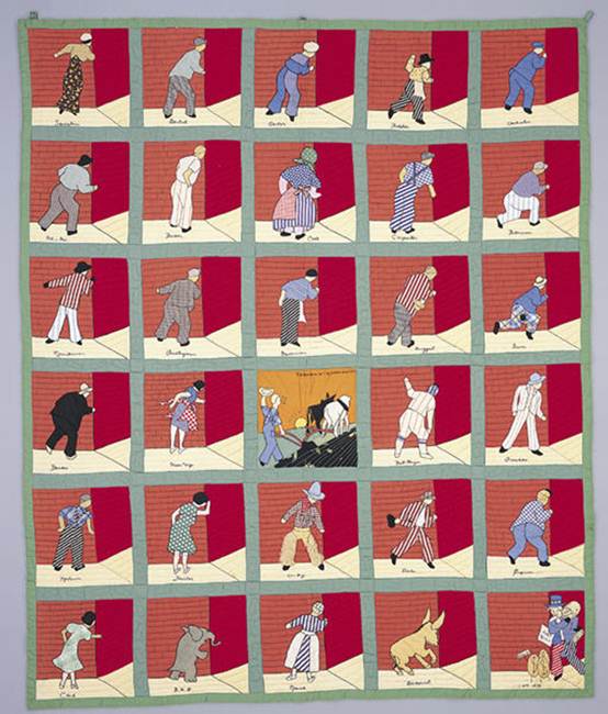 Fannie B. Shaw’s optimistic quilt was inspired by the prosperity promised by President Herbert Hoover: “Every time you picked up the paper or heard the radio he would talk about good times around the corner. He would make it sound so good. I wondered if I could make a picture of what he said and what he meant. I went to bed one night and couldn’t get it off my mind.” Here’s to optimism then and now!