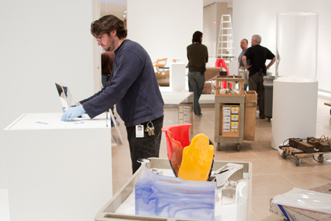 DMA exhibition staff, including preparators John Lendvay and Lance Lander and exhibitions graphic designer Kevin Parmer, install the newly opened Form/Unformed: Design from 1960 to the Presentin the Level 4 Tower Gallery.