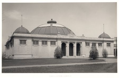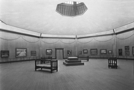 An interior view of the Free Public Art Gallery space in the Textile and Fine Arts Building, with the plaster cast of Winged Victory in the upper left.
