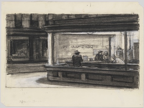 Edward Hopper, Study for Nighthawks, 1942, fabricated chalk and charcoal on paper, Whitney Museum of American Art, New York; purchase and gift of Josephine N. Hopper by exchange 2011.65, © Heirs of Josephine N. Hopper, licensed by the Whitney Museum of American Art, N.Y.