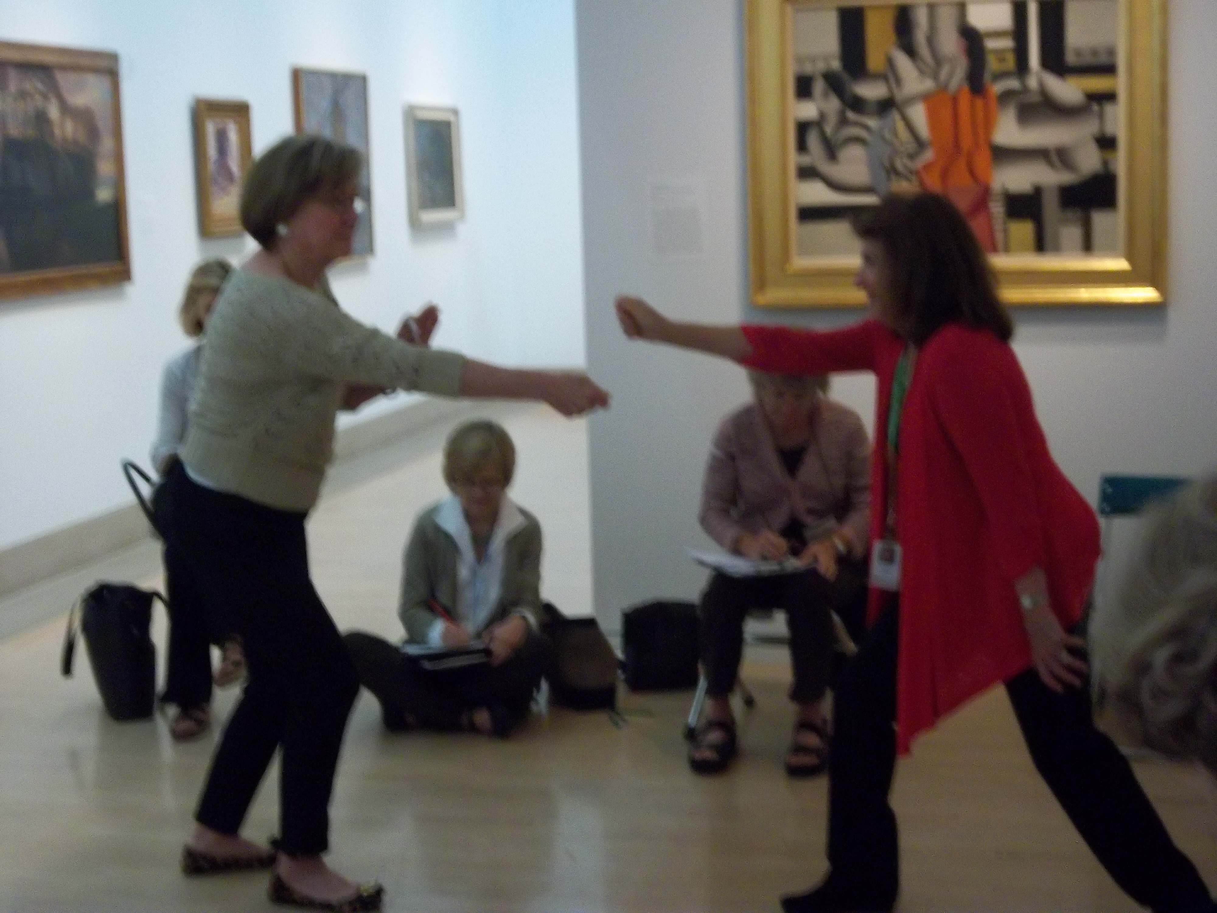 Docents Pat Altschuler and Susan Behrendt pose like a sculpture during the Cubism Game