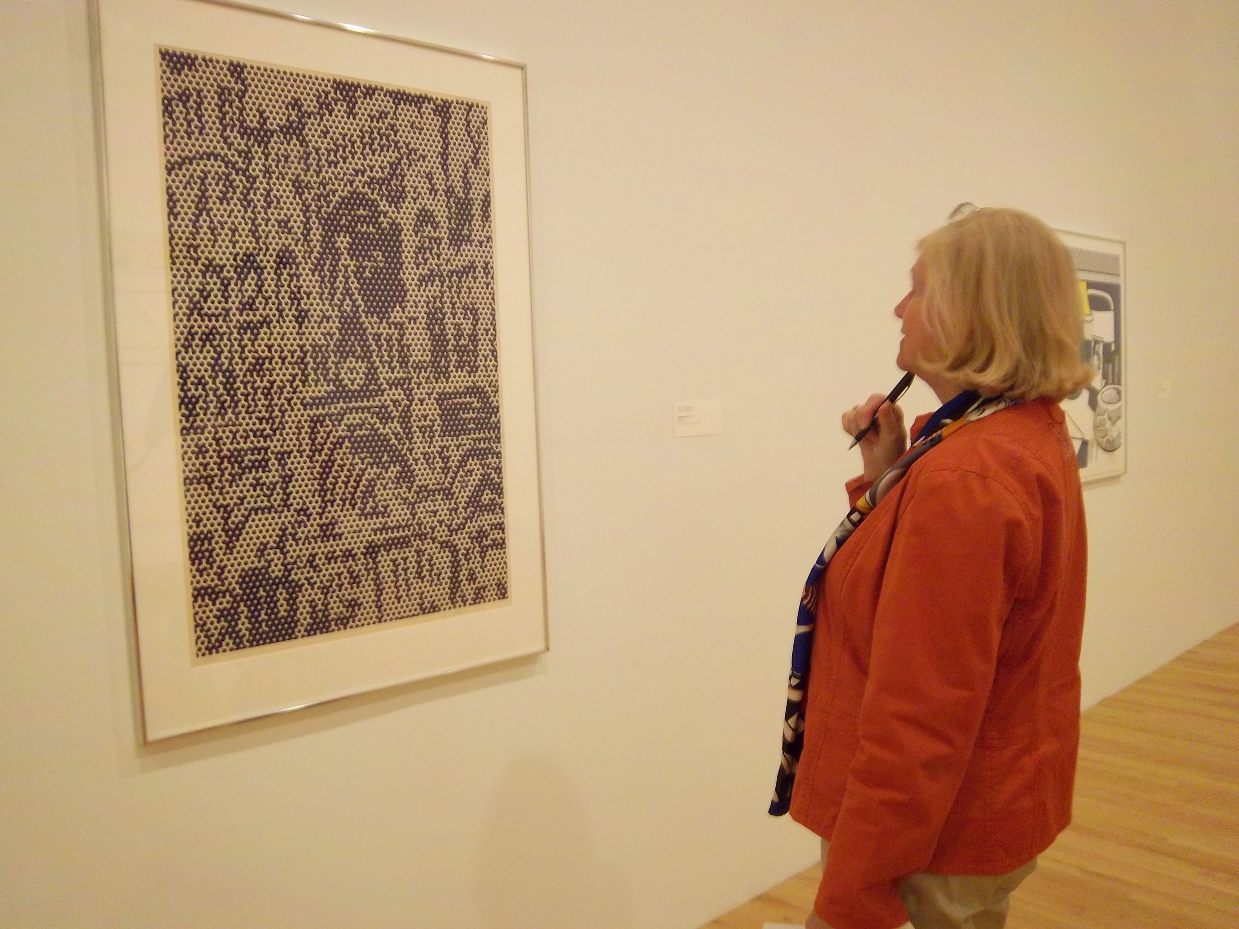 Docent Carol Placido ponders whether this Lichtenstein print matches her state of mind while playing Muse