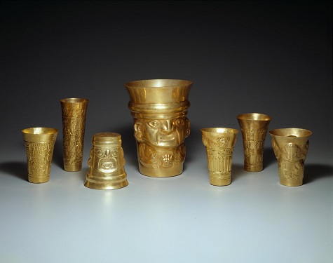 Group of beakers, AD 900-1100, Peru, North Coast, La Leche Valley, Batan Grande Region, Sican culture, Gold, Dallas Museum of Art, The Nora and John Wise Collection, gift of Mr. and Mrs. Jake L. Hamon, the Eugene McDermott Family, Mr. and Mrs. Algur H. Meadows and the Meadows Foundation, Incorporated, and Mr. and Mrs. John D. Murchison