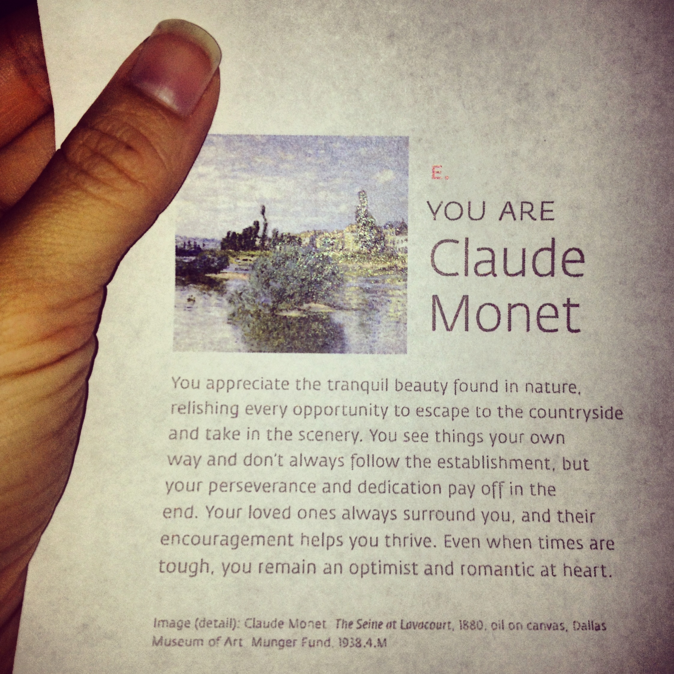 Later that week, we took the DMA’s Artist Personality Quiz to discover our DMA Art Doppelganger. The quiz provided a fun introduction to the DMA’s collection and we all found that it was extremely accurate in it’s suggestions! Personally, I was very happy to identify myself as a Claude Monet 🙂
