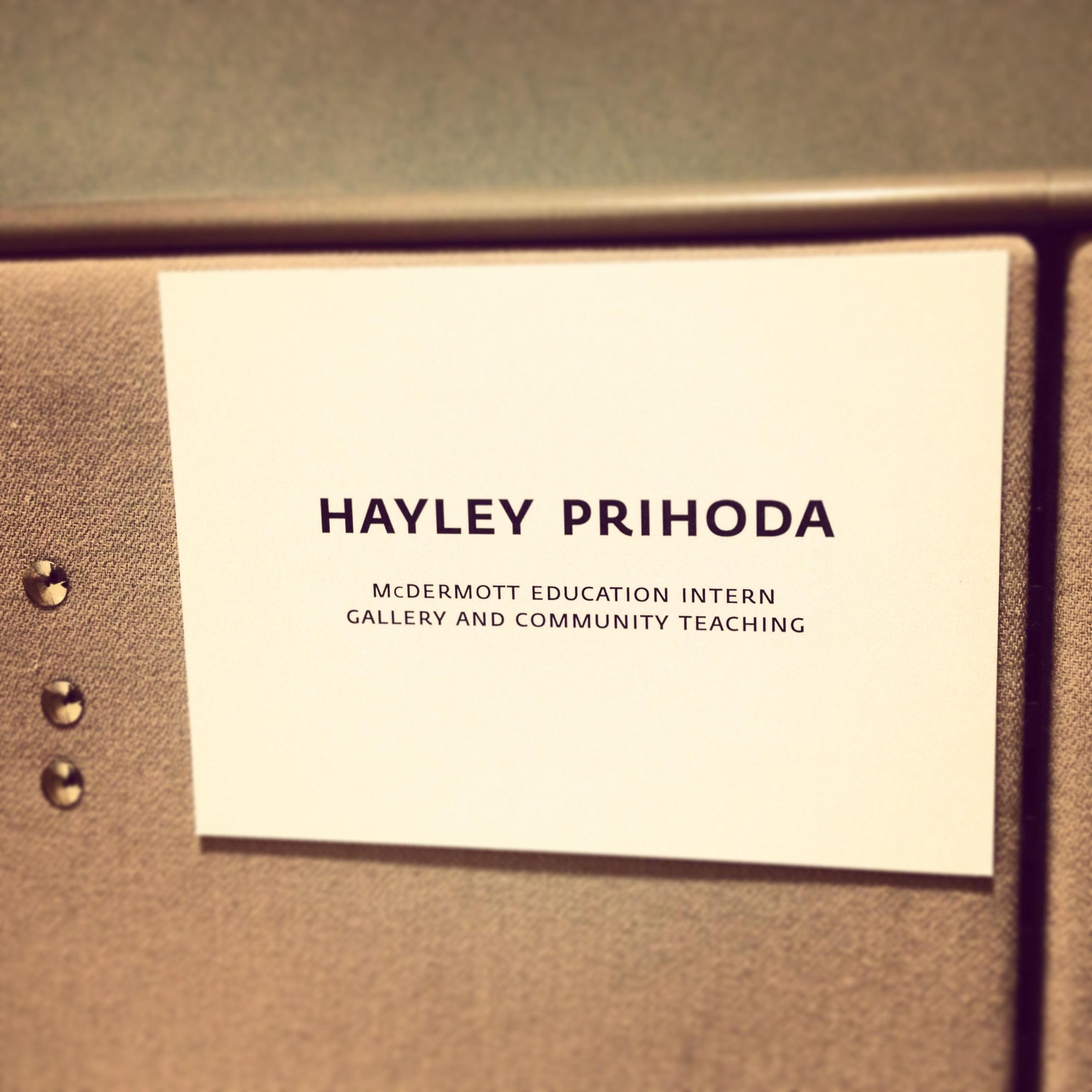 Our first day at the DMA was September 3, which primarily served as an orientation day. We enjoyed coffee and bagels as we filled out our employment paperwork, took photographs for our employee badges and learned the basics of navigating our way around the building. The highlight of the day, however, was the trip to the so-called Intern Pit. Most of the interns have a desk in this office area and we were excited to discover that our official plaques had already found their home!