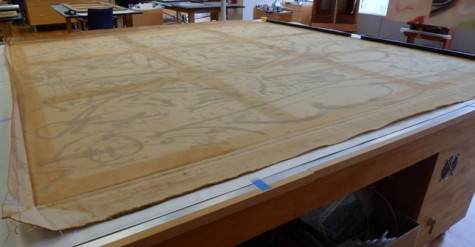 Jim carried out technical studies and conservation treatment on Echo, and we will be discussing some of the details of that work during our Late Night conversation. Here is a photo of the reverse of Echo during its treatment, with the stretcher removed, which reveals darkening of the canvas where it had been in direct contact with the wood stretcher support: