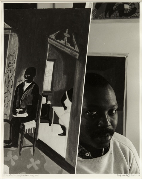Romare Bearden and Jacob Lawrence grew up in Harlem following the Harlem Renaissance and were profoundly influenced by the music, literature, and culture of their neighborhood. As young men, both participated in various community-based art classes and workshops in the area and were inspired by writer and philosopher Alain Locke. The two corresponded throughout the years, and some of their letters are available through the Archives of American Art.
