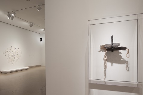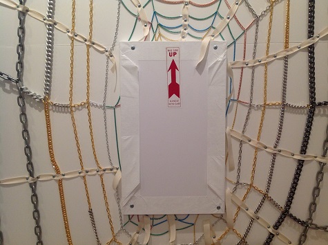 Eleven strips of twill are drilled into the foam backing of Untitled (Gate)’s crate to secure the chains for travel; the charms that hang in the center of the web are further protected by a Tyvek-covered foam sheet.