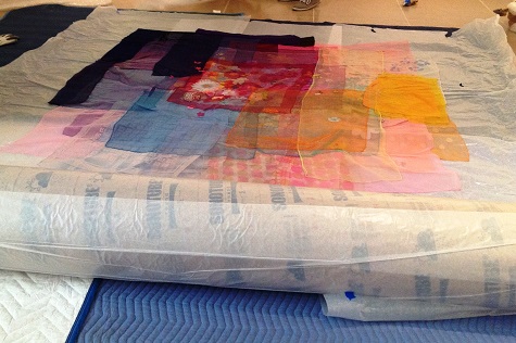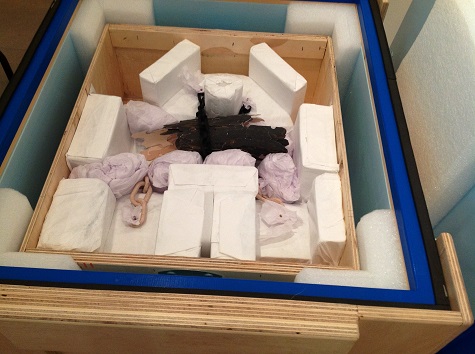 Anymore is pinned into place to prevent movement during transit, and then padded with Tyvek-covered bolsters and archival (acid-free) tissue paper.