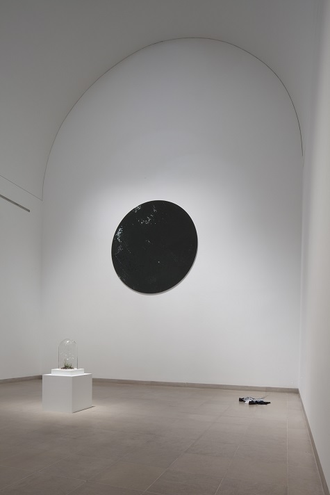 The black mirror Untitled hung high on the back wall of the Barrel Vault comes apart into five pieces; each is screwed into the back of a travel frame so that it “floats” and nothing touches its